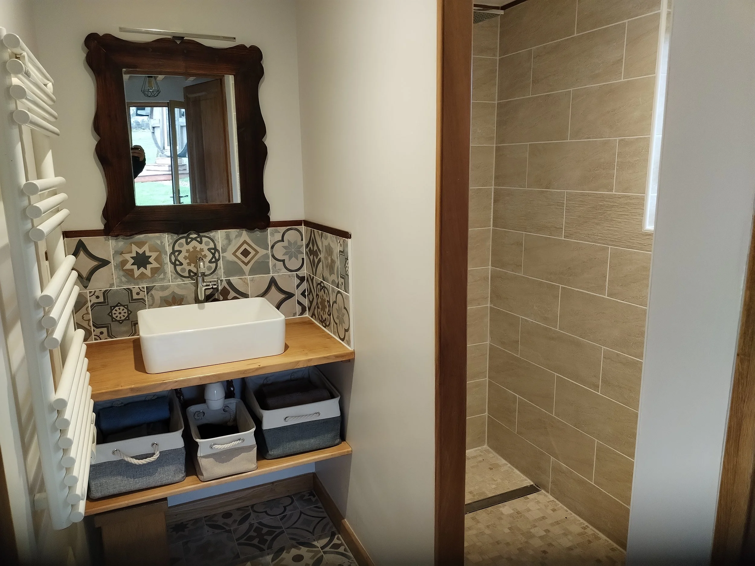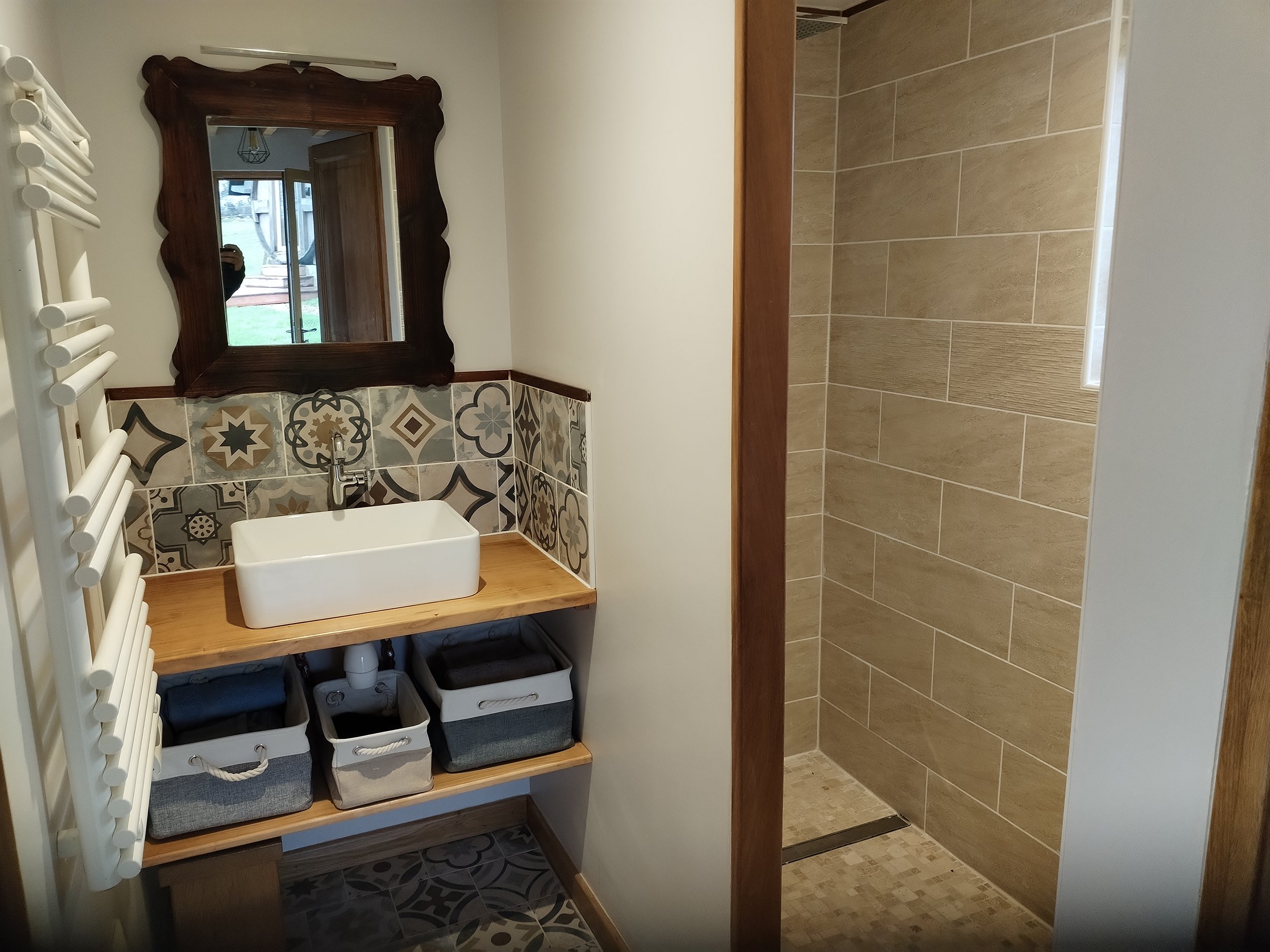 Salle de bain avec douche à l'italienne, linge de maison fourni, gel douche et shampoing