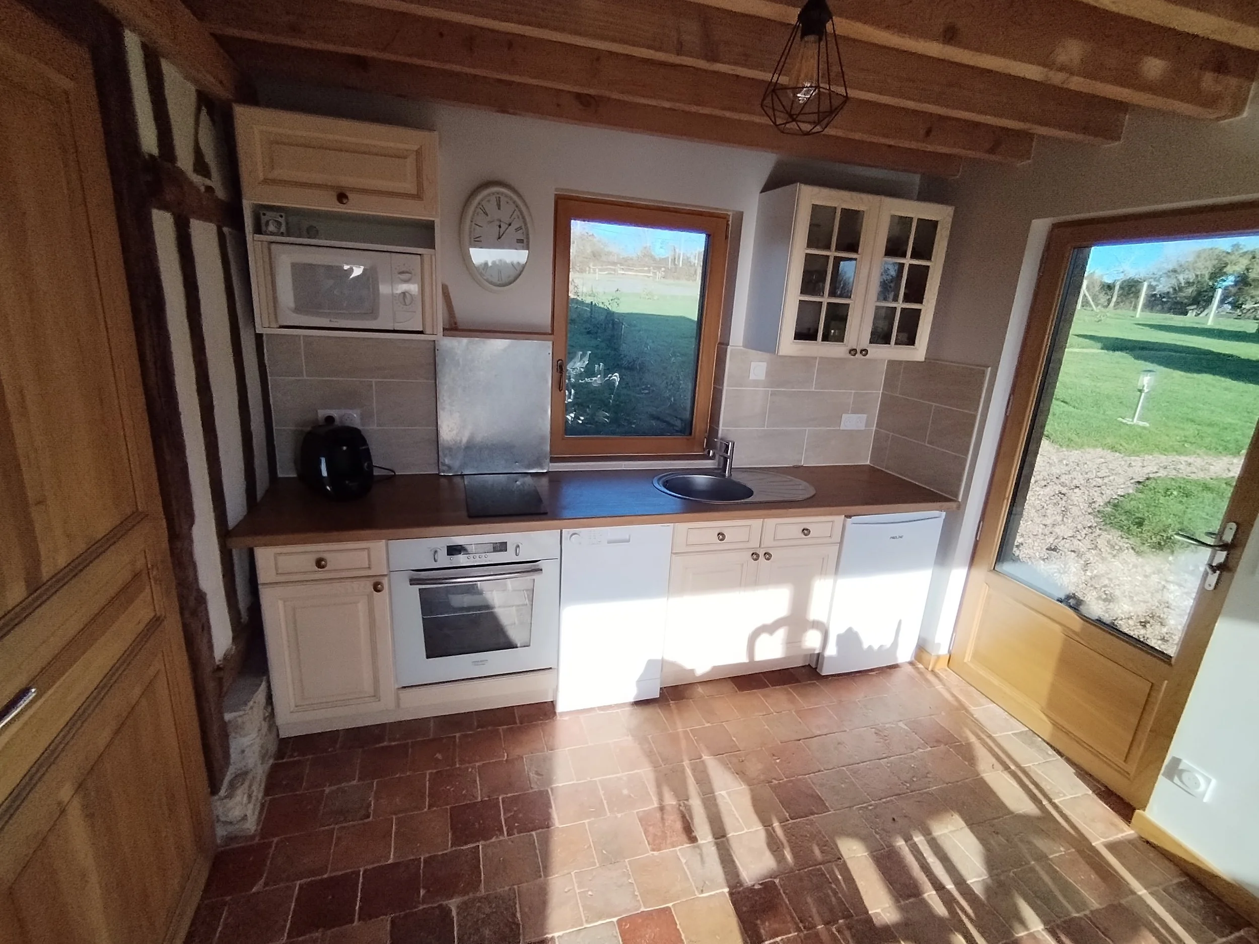 Cuisine équipée : Frigo, lave-vaisselle, four, micro-ondes, grille-pain, bouilloire, machine à café (Tassimo avec dosettes fournies), vaisselle complète, produits ménagés